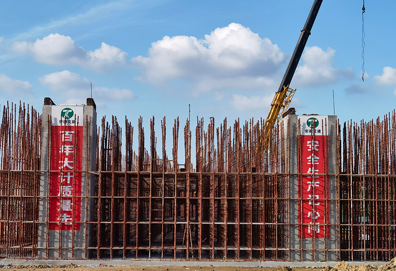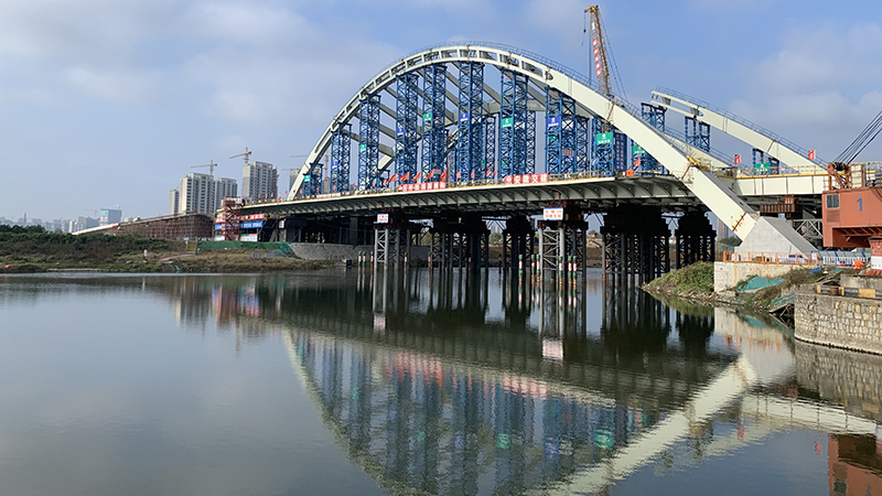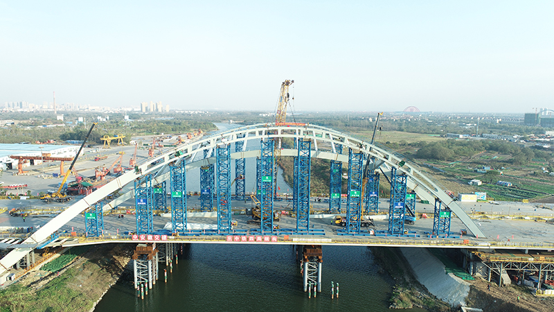 其中,廣德路跨南淝河段橋梁總長661米,由主橋、南北岸引橋三部分組成,主橋橋長230米,主梁采用55+135+45鋼箱梁,橋?qū)?3米,采用非對稱無推力鋼拱橋,步履式頂推法施工,該橋梁目前為國內(nèi)在建同類結(jié)構(gòu)跨度最大鋼箱拱橋。另,橋梁大體積承臺8號墩混凝土8870立方,凈矢高27.5米,本工程拱肋為三維曲線造型,邊拱在平面的投影亦為曲線,拱腳為箱形,中間部位邊拱由兩個上拱箱和一個下拱箱組成,三個獨立拱箱在第一根吊桿之前合并并過渡到一個整體箱形截面,結(jié)構(gòu)復雜,拱肋的精細化加工,梁拱關(guān)鍵節(jié)點的定位及安裝是本工程的重點,也是本工程的難點。南北岸引橋總長431米,采用上下行兩幅布置,單幅橋?qū)?4.5米,采用現(xiàn)澆預應力混凝土連續(xù)箱梁結(jié)構(gòu)。